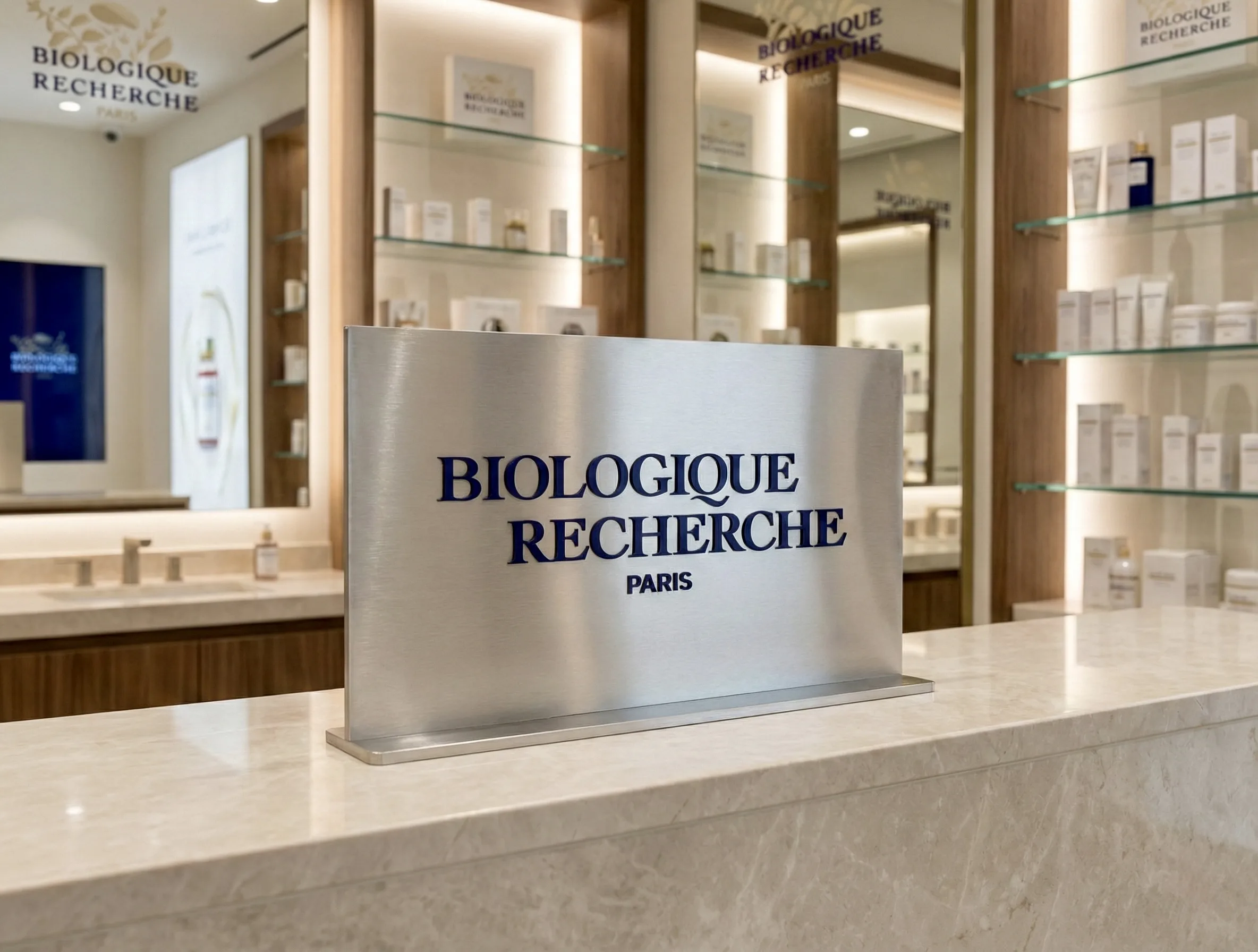 Custom counter signage fabricated in brushed steel for Biologique Recherche Paris, designed to complement the brand's refined aesthetic in a luxury retail environment.