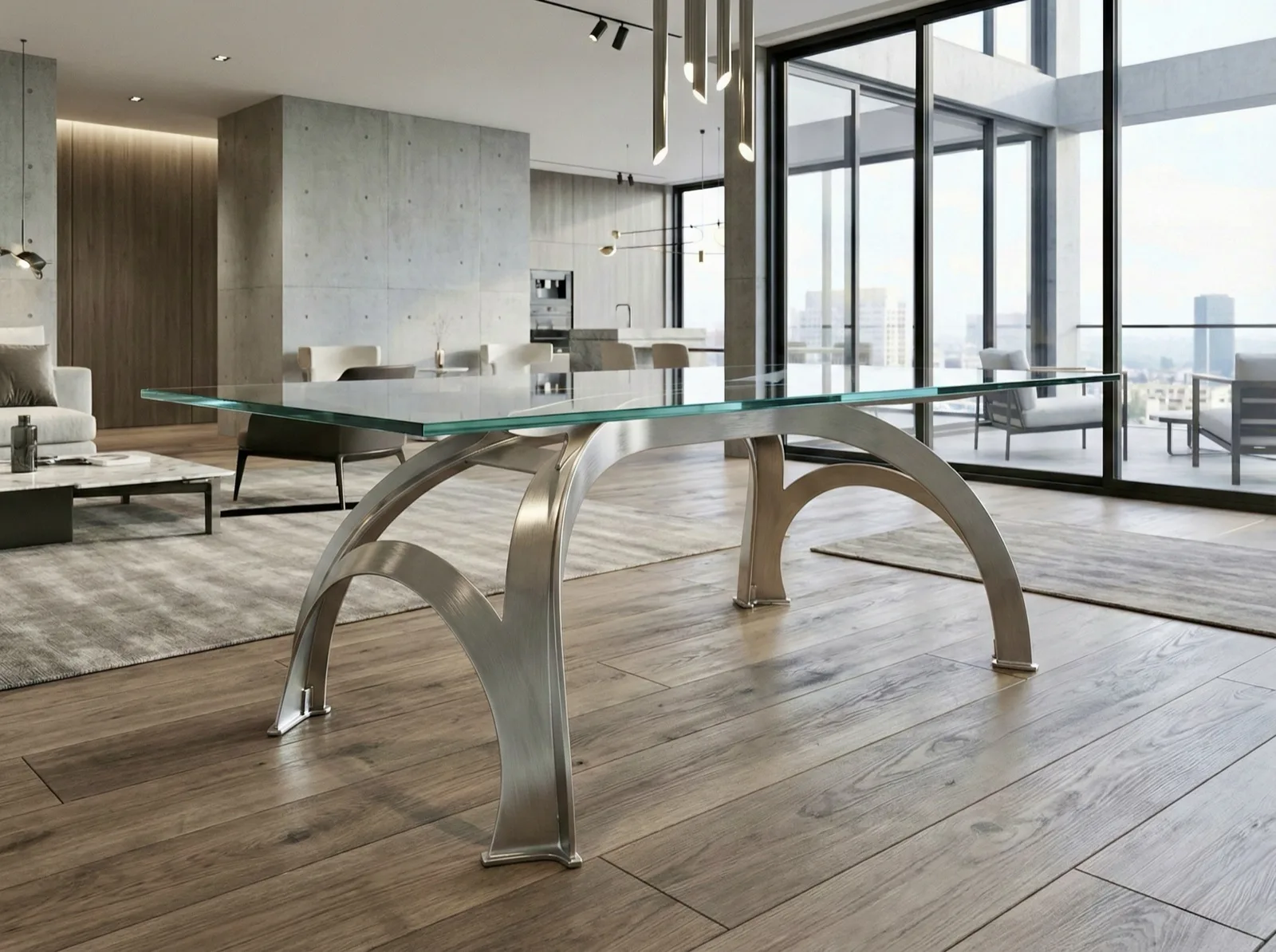 Custom dining table inspired by the structural legs of the Eiffel Tower.