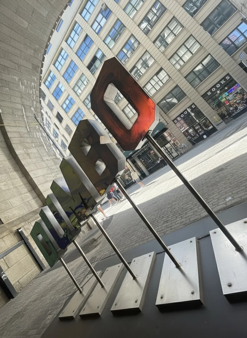 The piece consists of oversized three-dimensional letters mounted on a polished steel base, designed to serve as a neighborhood landmark and public gathering point.