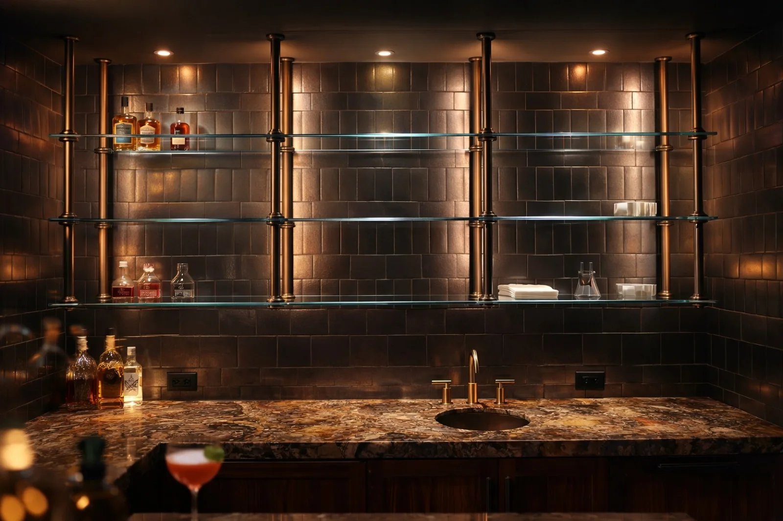 Patinated Brass Kitchen Bar Shelving