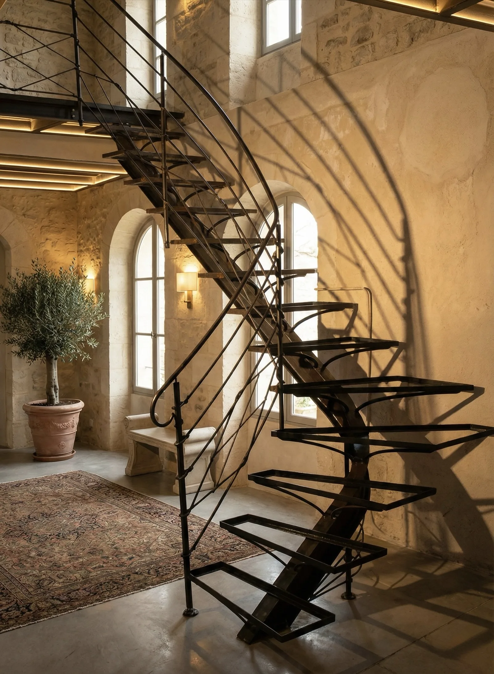 The central spine of the stair is made from a structural I-beam (IPN) that was heated and twisted, forming a dynamic architectural element that supports the floating steel step frames. The railing is entirely fabricated from hand-forged steel, with slender bars and subtle curves that reinforce the organic flow of the staircase.