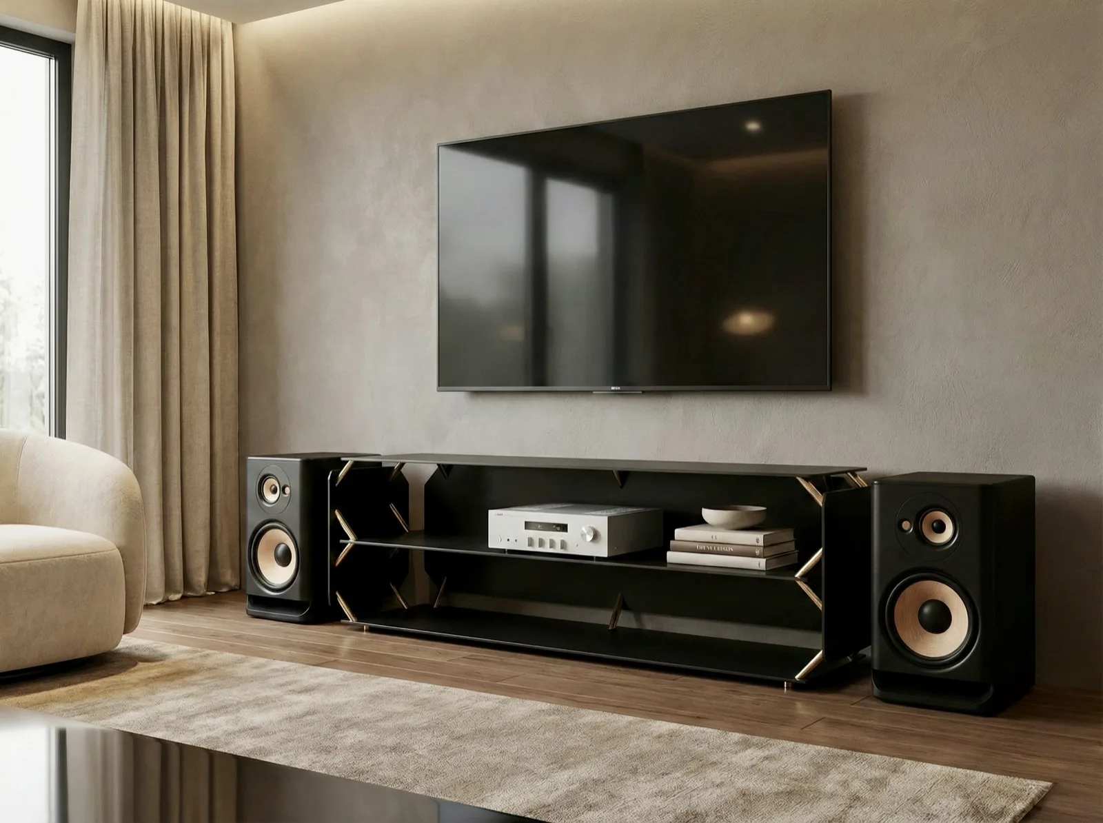 Custom TV stand in natural black patinated steel for a private residence in New York.